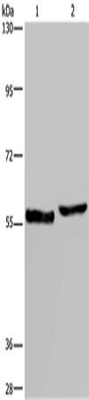 Western Blot analysis of Human testis tissue and A375 cell using SLC1A6 Polyclonal Antibody at dilution of 1:400