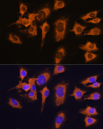 Immunofluorescence analysis of C6 cells using SLC20A1 Polyclonal Antibody at dilution of 1:100. Blue: DAPI for nuclear staining.