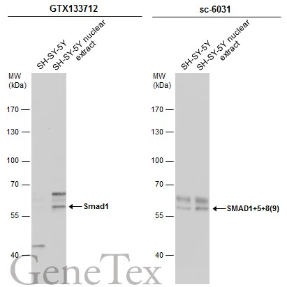 SH-SY-5Y whole cell and nuclear extracts (30 μg) were separated by 7.5% SDS-PAGE, and the membranes were blotted with Smad1 antibody (GTX133712) diluted at 1:1000 and competitor"s antibody (sc-6031) diluted at 1:100. The HRP-conjugated anti-rabbit IgG antibody (GTX213110-01) was used to detect the primary antibody. *The competitor is not affiliated with GeneTex and does not endorse this product.