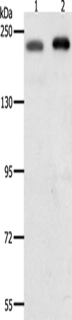 Western Blot analysis of Hela and Jurkat cell using SMARCA4 Polyclonal Antibody at dilution of 1:700