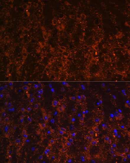 Immunofluorescence analysis of Mouse brain using SNX13 Polyclonal Antibody at dilution of 1:100. Blue: DAPI for nuclear staining.
