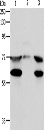 Western Blot analysis of Hela cell, Mouse testis tissue and Jurkat cell using CCDC99 Polyclonal Antibody at dilution of 1:400
