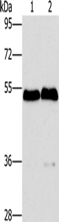 Western Blot analysis of Mouse brain and liver tissue using SPHK2 Polyclonal Antibody at dilution of 1:200