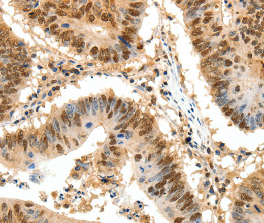 Immunohistochemistry of paraffin-embedded Human colon cancer tissue using SSB Polyclonal Antibody at dilution 1:50