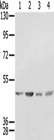 Western Blot analysis of K562, 231, Raji and hela cell using SSB Polyclonal Antibody at dilution of 1:400