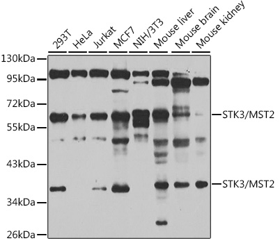 Western blot analysis of extracts of various cell lines using STK3/MST2 Polyclonal Antibody at 1:1000 dilution.