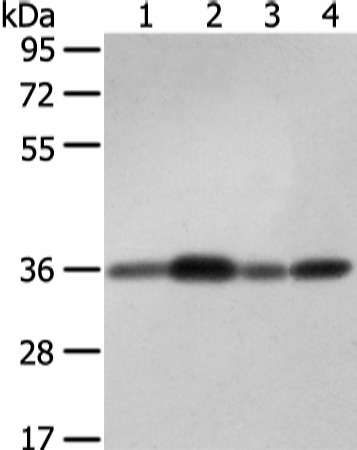 Western Blot analysis of 231, 293T and hepg2 cell, Mouse brain tissue using STX12 Polyclonal Antibody at dilution of 1/400
