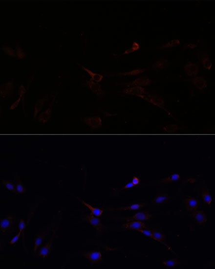 Immunofluorescence analysis of C6 cells using SUCLG1 Polyclonal Antibody at dilution of 1:100. Blue: DAPI for nuclear staining.