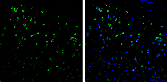 Syntenin 1 antibody [C2C3], C-term detects Syntenin 1 protein by immunohistochemical analysis. Samples: Frozen Sectioned adult mouse brain. Green: Syntenin 1 protein stained by Syntenin 1 antibody [C2C3], C-term (GTX108470) diluted at 1:250. Blue: Fluoroshield with DAPI (GTX30920).