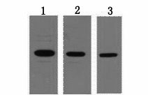 Western Blot analysis of 0.5ug T7 fusion protein using T7-Tag Monoclonal Antibody at dilution of 1) 1:3000 2) 1:5000 3) 1:10000.