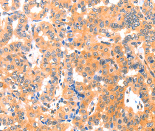 Immunohistochemistry of paraffin-embedded Human thyroid cancer tissue using THBS1 Polyclonal Antibody at dilution 1:60