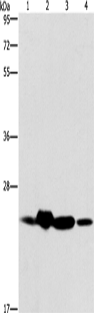 Western Blot analysis of Mouse spleen and Human fetal liver tissue, hela cell and Human fetal brain tissue using THOC7 Polyclonal Antibody at dilution of 1:450