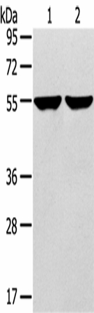 Western Blot analysis of 231 and hepg2 cell using TRIM62 Polyclonal Antibody at dilution of 1:400
