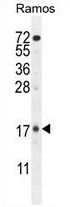 TTC9C Antibody (N-term) western blot analysis in Ramos cell line lysates (35 ug/lane). This demonstrates the TTC9C antibody detected the TTC9C protein (arrow).