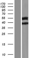 Western blot validation of overexpression lysate (Cat# LY423431) using anti-DDK antibody (Cat# TA50011-100). Left: Cell lysates from un-transfected HEK293T cells; Right: Cell lysates from HEK293T cells transfected with RC221841 using transfection reagent MegaTran 2.0 (Cat# TT210002).