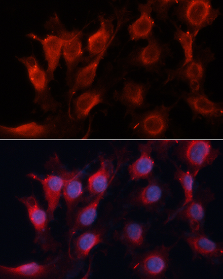 Immunofluorescence analysis of HUVEC cells using VEGF Polyclonal Antibody at dilution of 1:100 (40x lens). Blue: DAPI for nuclear staining.