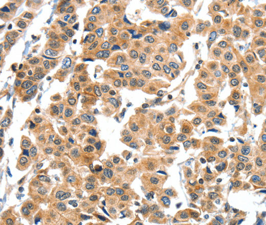 Immunohistochemistry of paraffin-embedded Human breast cancer tissue using XBP1 Polyclonal Antibody at dilution 1:60
